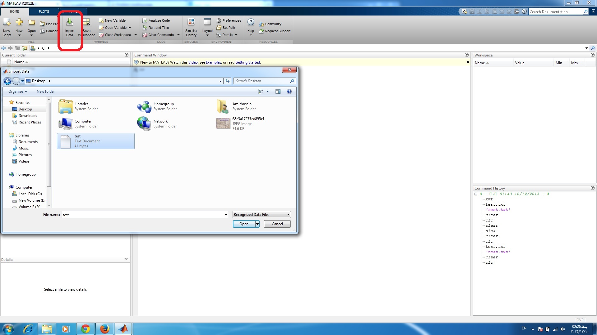 در منوی نرم افزار متلب روی گزینه import data کلیک می کنیم .